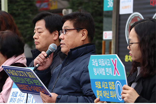[사진설명④] 의료사고 피해자와 유족, 환자단체 대표들이 11월 7일(수) 오전 10시 서울 용산구에 위치한 대한의사협회 임시회관 앞에서 <의료사고 피해자와 유족의 고통을 외면하고, 환자를 선별하는 진료거부권 도입과 과실 의료사고에 대해 형사처벌을 면제하는 특례법 제정을 요구하는 대한의사협회를 규탄한다> 주제로 기자회견을 개최하였다. 사진은 <의료사고로 대학병원 영안실에 7년간 냉동 보관된 제 딸 김민주 양의 억울함을 풀어 주세요> 제목으로 청와대 국민청원을 진행중인 (고) 김민주 양 아버지 김국선 씨가 의료사고 입증책임의 어려움을 토로하고 있다.