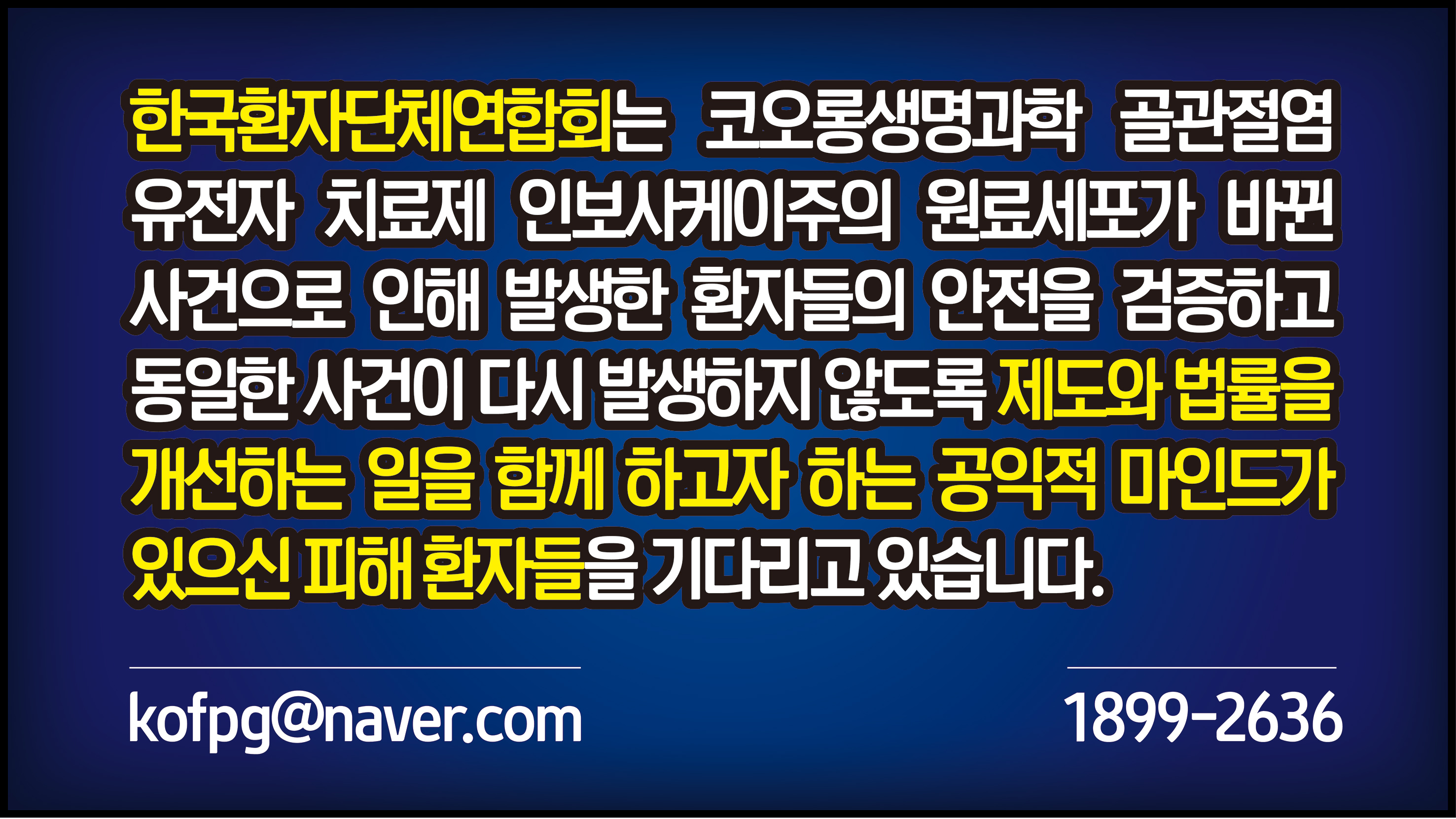 한국환자단체연합회는 앞으로 코오롱의 인보사 원료세포가 종양 발생 가능성이 있는 ‘TGF-β1 유전자가 삽입된 태아신장유래세포(GP2-293세포)’로 바뀐 사건으로 인해 발생한 해당 환자들의 안전을 검증하며, 피해 보상만이 아니라 동일한 사건이 재발하지 않도록 제도와 법률을 개선하는 공익활동(https://www.patientvoice.kr)을 해당 환자들과 함께 전개할 예정이다.